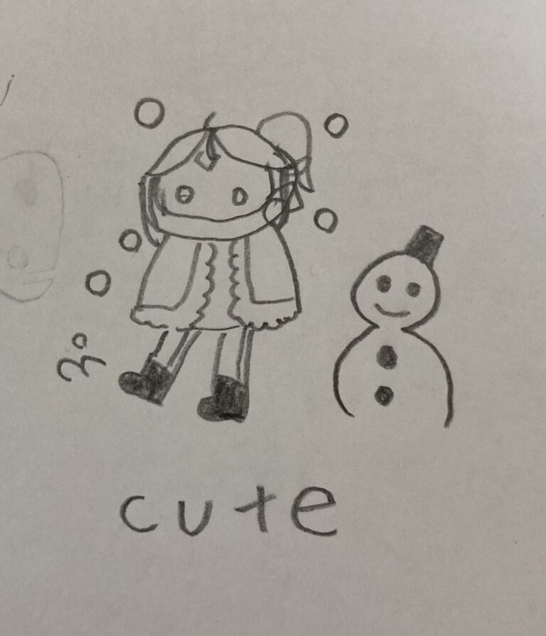 マフラー、もこもこケープ、デニム、長靴を穿いているミライちゃん。立派な雪だるまもかわいいね。