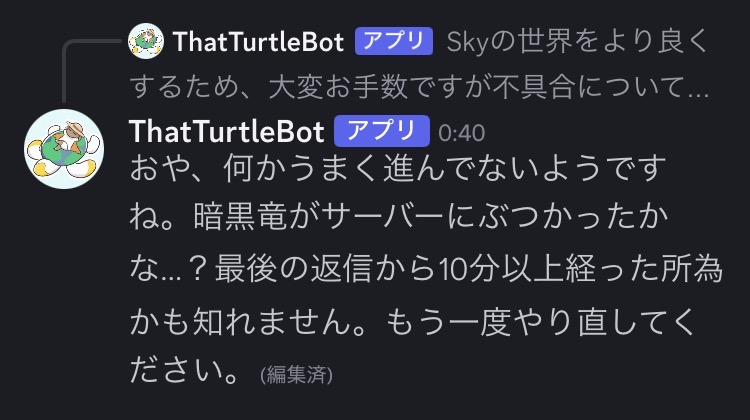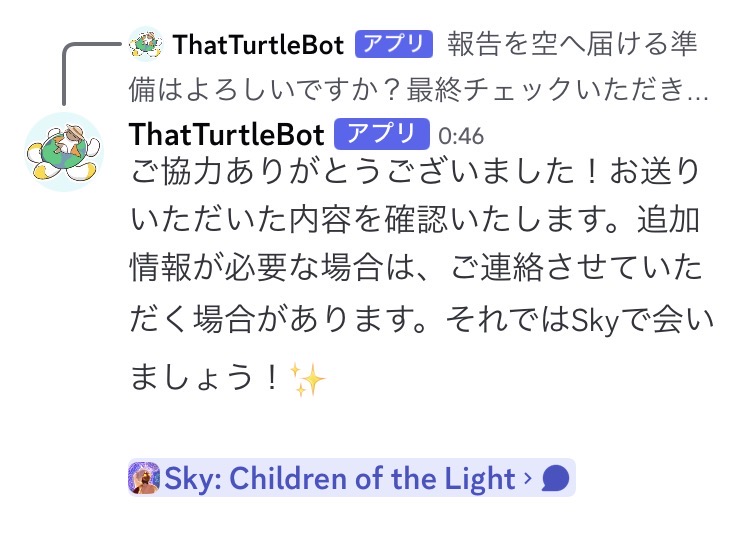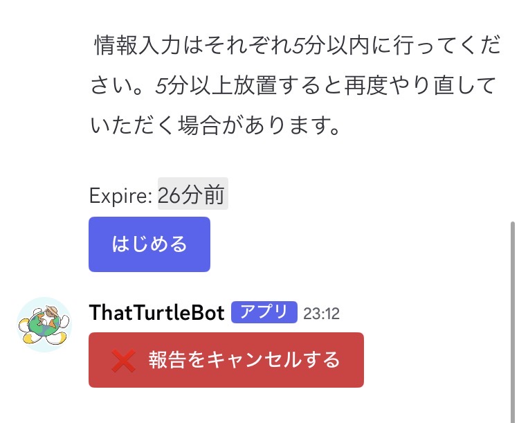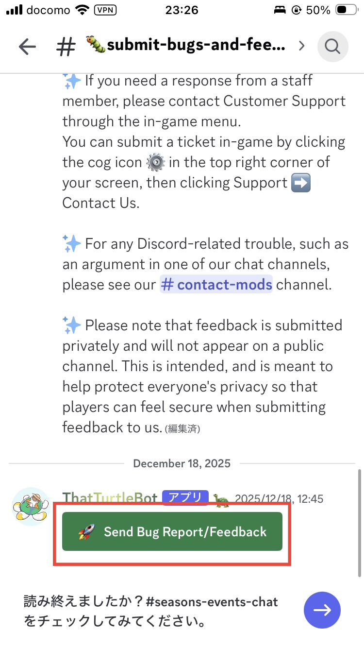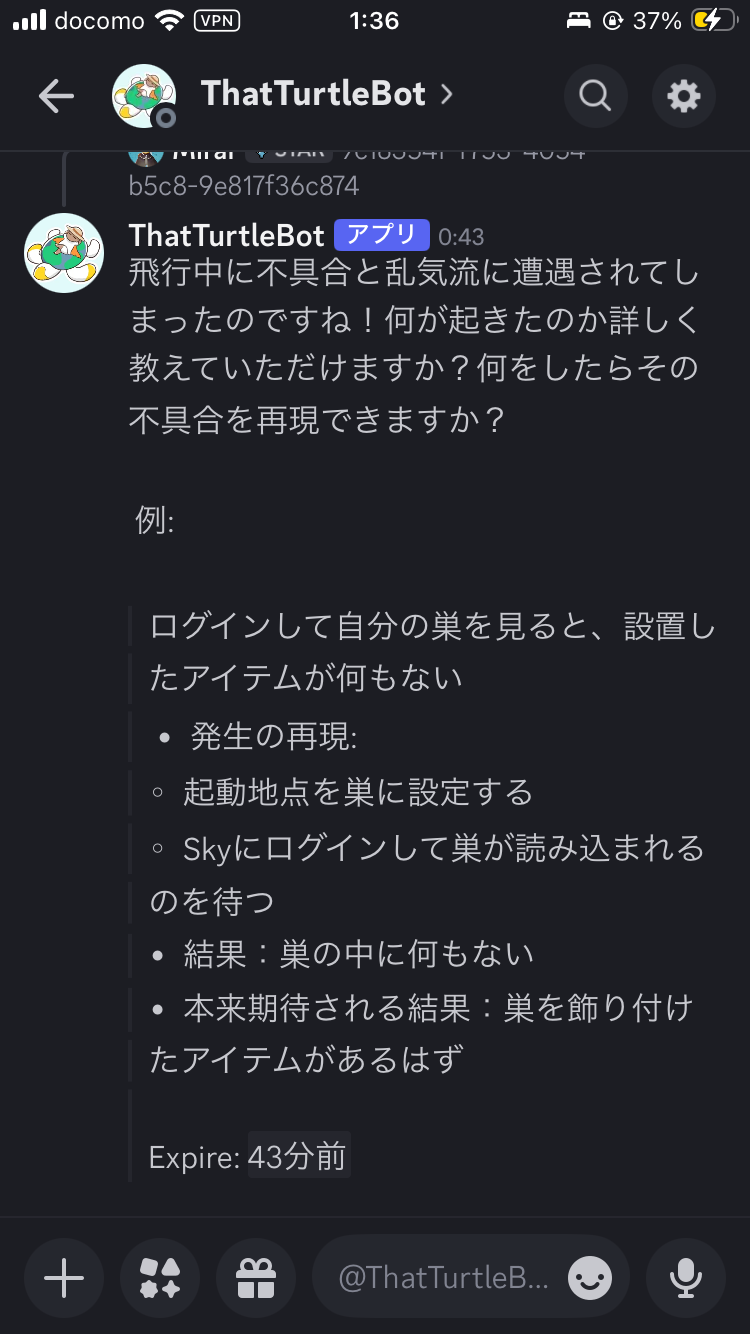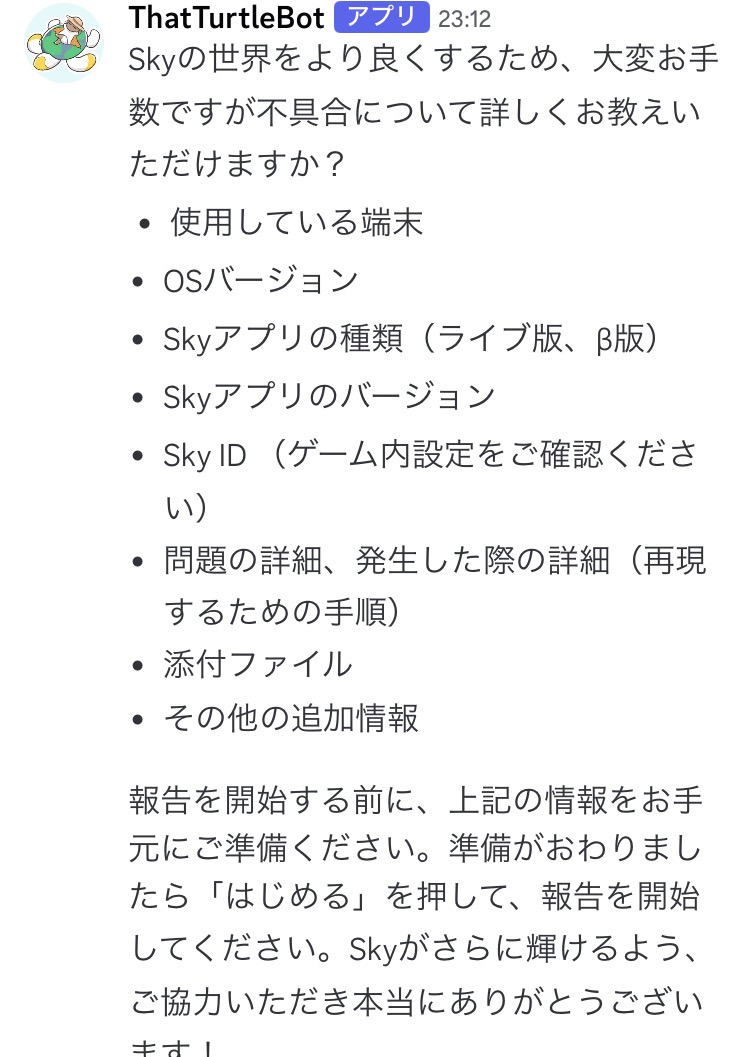 感想: discord の報告は、アプリ内のサポートチャットよりもやりやすいと感じた。サポートチャットは一言で全てを話さないといけない上に、ファイルなうで画像を用意しないといけない。一方で、discord は報告前に確認事項を示していたり、一つずつ質問したりするので、不安にならないで回答でき、さらに画像を直接送信できるのでストレスが少なかった。