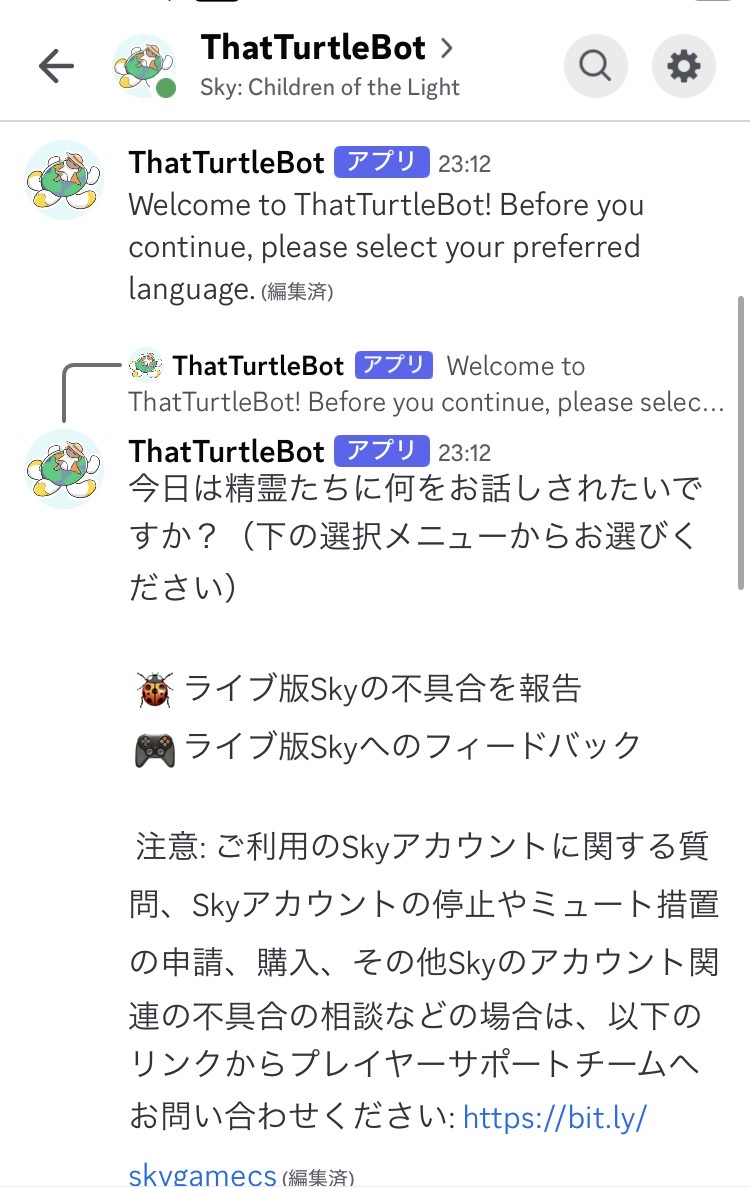 DMで言語選択とバグ・フィードバック選択をするとこのDMが送られる。