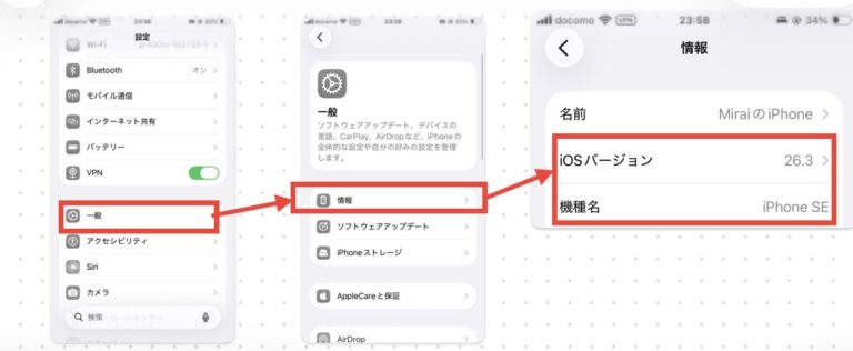 端末情報とOSの確認は、iPhoneの場合、ホーム画面から設定を開いて「一般」→「情報」