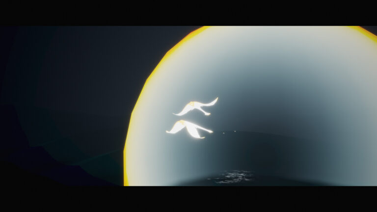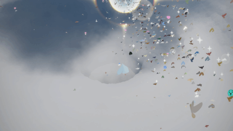 最初は鳥の視点。雲間を飛んでいると、雲の穴とも切れ間とも取れる渦が現れます。捨てられた地の入口にあるあの渦とも似ています。