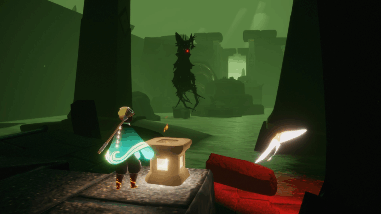 ここからは蝶に変わって、捨てられた地の神殿前を飛んでいきます。蝶は鳥よりも小さくか弱いですが、捨てられた地の環境下でも生きていける生命力をもっているようですね。
