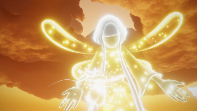 この後、蝶は朝日のように輝き登ってくる巨大なAURORAさんの前で本来の星の子の姿に戻り、一緒に天へと昇って行きます。
