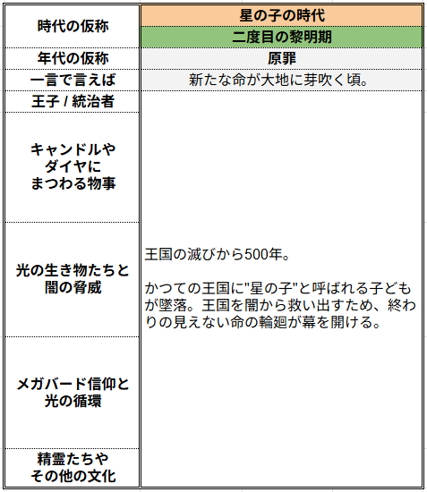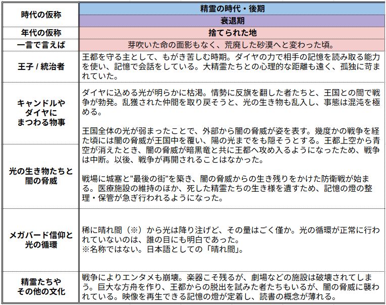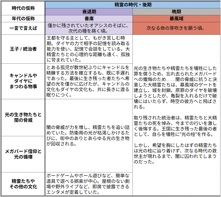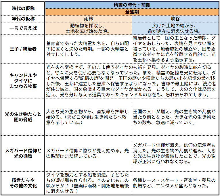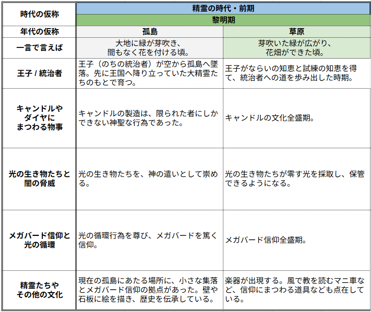 精霊たちの時代に何が起こったのか、統治者はどうしたのか、キャンドルやダイヤの文化の変化など、5つの観点から考察した、総合的な年表です。