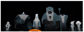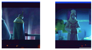 アニメ前篇 第三章、統治者の心理状態が垣間見えるシーンに、書庫の大精霊も登場します。闇の脅威に四方を囲まれ劣勢を強いられた状況に、統治者が苦しみを滲ませる中、書庫の大精霊は静かに現れます。何かの気配を察したであろう統治者は、自らの視線を書庫の大精霊へと向けますが、その場から歩を進める様子はありません。このときの統治者をよく見ると、マスク中央部分が僅かに青く光る様子を確認できます。