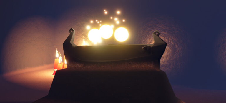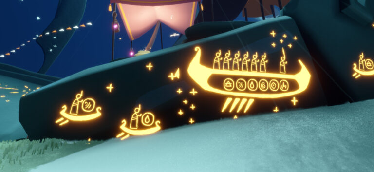船のオブジェの上に、3つの光が浮かんでいますね。この船、魔法の案内人が頭に乗せている船と雰囲気が似ていると思いませんか?