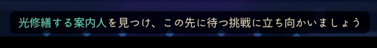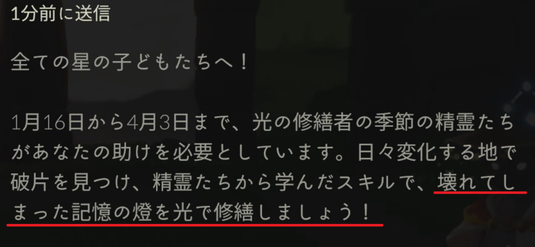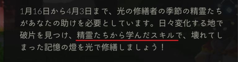 最後に、光の修繕者の季節の物語で伝えたかったことを考えます。エンディングムービーと季節のクエスト開始時のムービーに着目しましょう。